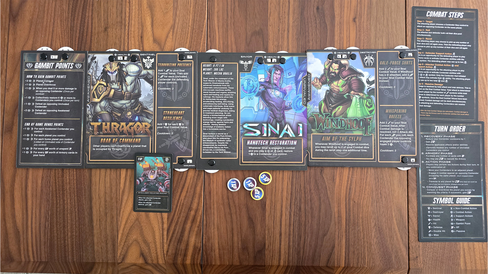 For players who love rolling dice, Cosmic Conquest will speak directly to your soul, as this is a dice-chucking game through and through. Combat sees both the attacker and defender rolling a bunch of dice, counting and comparing symbols, and then using their powers or equipment cards—bought from the Armory—to augment and adjust their rolls. To add further spice, planets that players can conquer (nine were included in my prototype) provide passive bonuses to any team holding them. For instance, Synthoria hinders opponents’ Awakened contenders by limiting the number of dice they can reroll while defending against your attacks. This all culminates in quite the action-packed skirmish game that fans of Ameritrash games will gravitate toward.