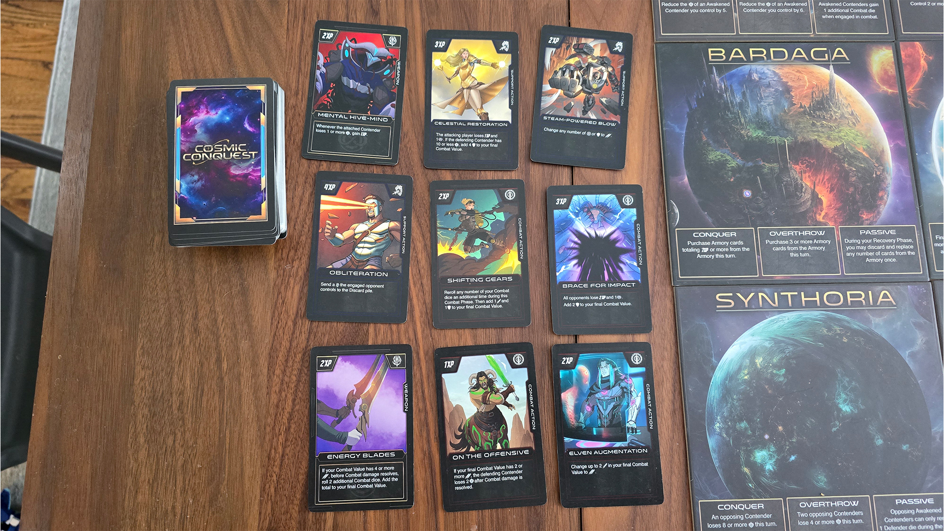 What grabbed my attention right away with Cosmic Conquest—before I dove into the mechanics or gameplay, before I even opened the box—is the game’s fantastic art. It comes as no surprise, considering the team at Rising Empire Studios is building off an IP that includes a comic book, among other things, but the bright and dynamic look of all the contenders and 80+ Armory cards really stands out and grabs the eye. I would put the visuals up against any of the other heavy-hitter comic book houses—it’s that impressive.