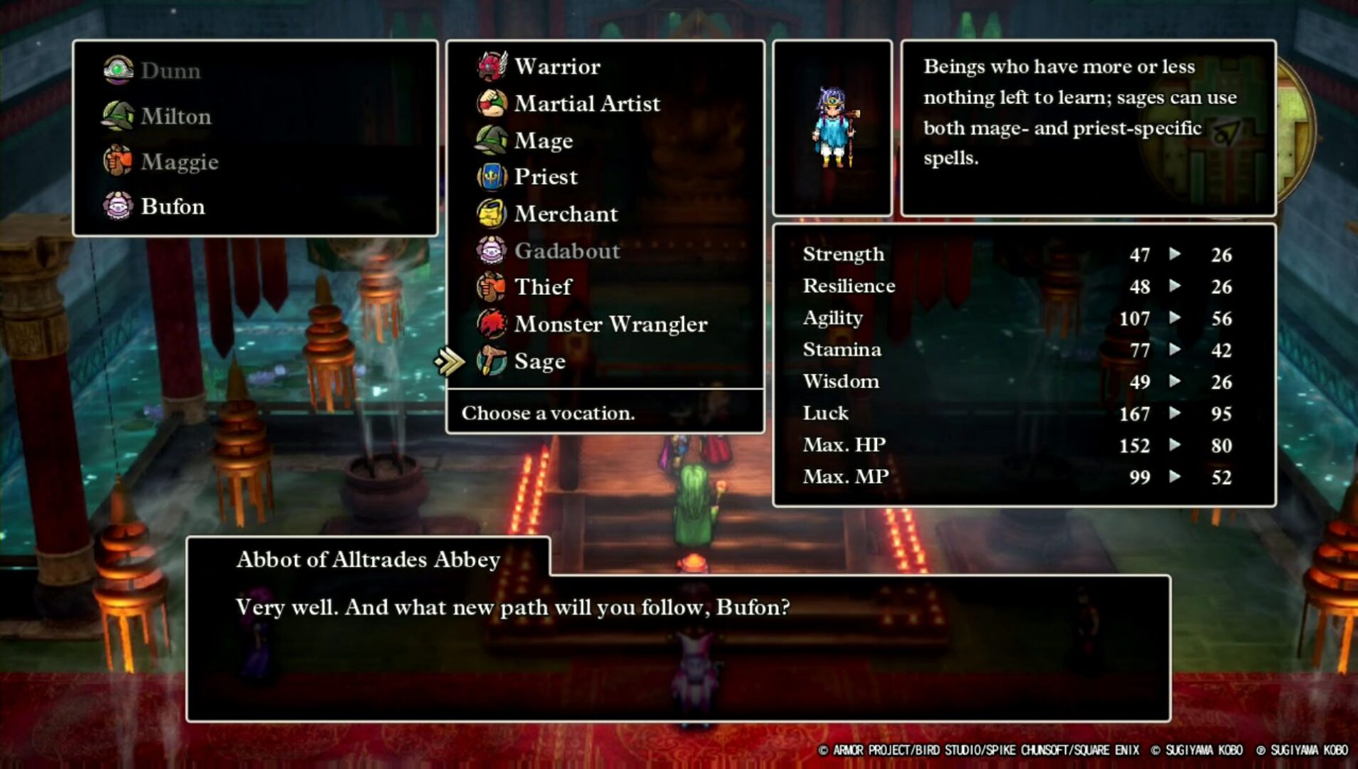 Instead of opting for a defined party of characters with distinct personalities and backstories, the rest of your forces—apart from the main Hero—are composed of mercenaries you create from one of the game’s nine classes (eight available from the start). These characters don’t impact the story, react to events, or serve as anything more than troops on the battlefield—an approach common in the early days of RPGs. Out of the selectable vocations, new to this version of DQIII is the Monster Wrangler, which uses monsters to help in combat. It’s a fun class, but I preferred the old classics. I love that you can now customize the look of the party, selecting different body types, head options, and hair colors before assigning bonus skill points to their stats upon creation. To create your ideal party, with all the skills and stats necessary to tackle the toughest challenges (including the new Draconian Quest difficulty), you can expect to be grinding a lot and re-specing your characters into new jobs at the Alltrades Abbey to ensure you have everything you need.