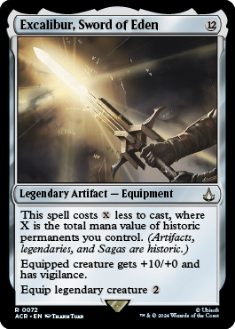 For your big damage dealer, you can’t get bigger than Excalibur, Sword of Eden from the Assassin’s Creed set. This mighty 12-drop’s cost is reduced by the number of historic (artifacts, legendaries, and sagas) cards you have in play, and in a deck full of equipment artifacts for Cap to chuck at opponents, you could get this out cheaply. With the Puresteel Paladin and Training Grounds combo mentioned earlier, you’ll be tapping a single mana to hit something for 12, over and over, as Captain America hurls swords at people. Glorious.