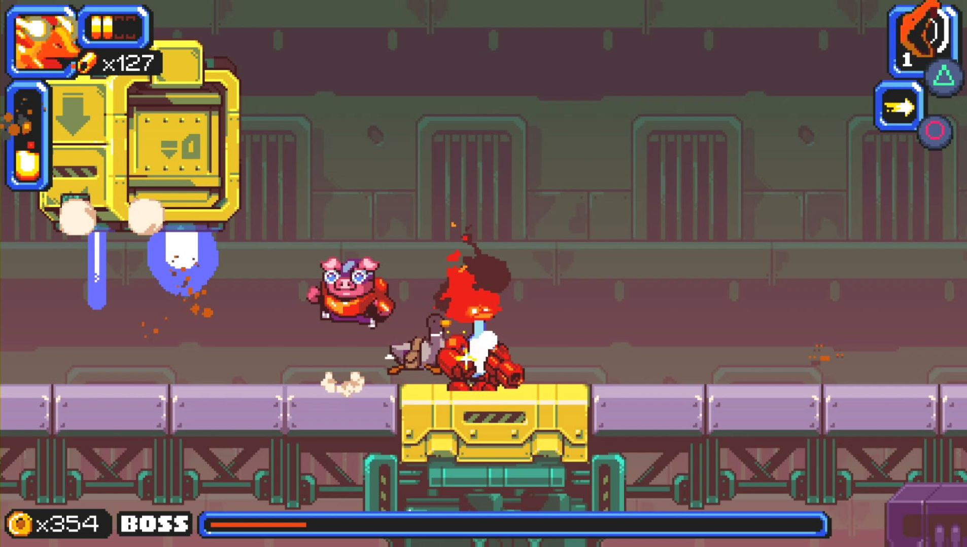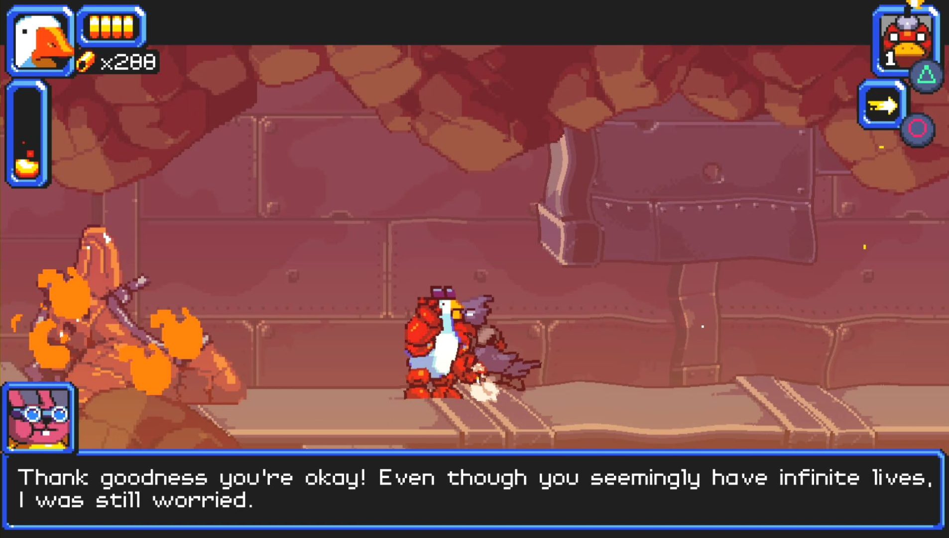 Some mechanics of Mighty Goose I felt weren’t brought to my attention either, only stumbling on them by luck. For most of my time with the game, I thought that the triangle button was a designated “honk” button, when in fact, it was for sub-weapons. These sub-weapons are unlocked similarly to the augments by completing levels. However, these sub-weapons are in a separate tab in the armory, which can be missed. I don’t recall any sort of pop-up mentioning them either.