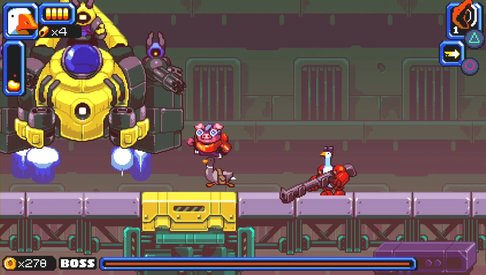 Geese are angry creatures, sometimes scary creatures. Mighty Goose, from developer BlastMode, asks the question: if you gave a goose a power suit, some guns, and a tank, could they save the universe? Spoilers, yes, yes they could. As an action platformer for one or two players in a similar vein to the classic Metal Slug games, it puts you in the role of a goose strapped into a battle suit, given a small armory worth of weapons and sent to kill the evil Void King. Along the way, you will rescue some pigs, recruit companions like Regular Duck, and pilot heavy machinery. This all results in one of the most fun action platformers I’ve had in a long time.