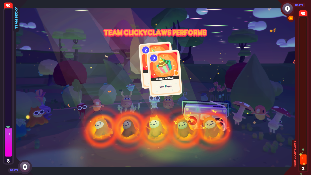 When you initiate a battle, either by gathering the items necessary or by entering the Dance Barn. The dance battles resemble a turned-based card builder. On either side of the screen there is a bar which is counting your dance points, it can vary from anywhere to twenty to forty dance points. The number of points needed to win is dictated by how many Ooblets are needed for that particular battle. The amount of cards you can play depends on your beats, which is your mana so to speak. Some cards can grant a buff or debuff, fluster & hype. Hype allows for you to increase the amount of dance points you can do with a single card and Fluster does the opposite.
