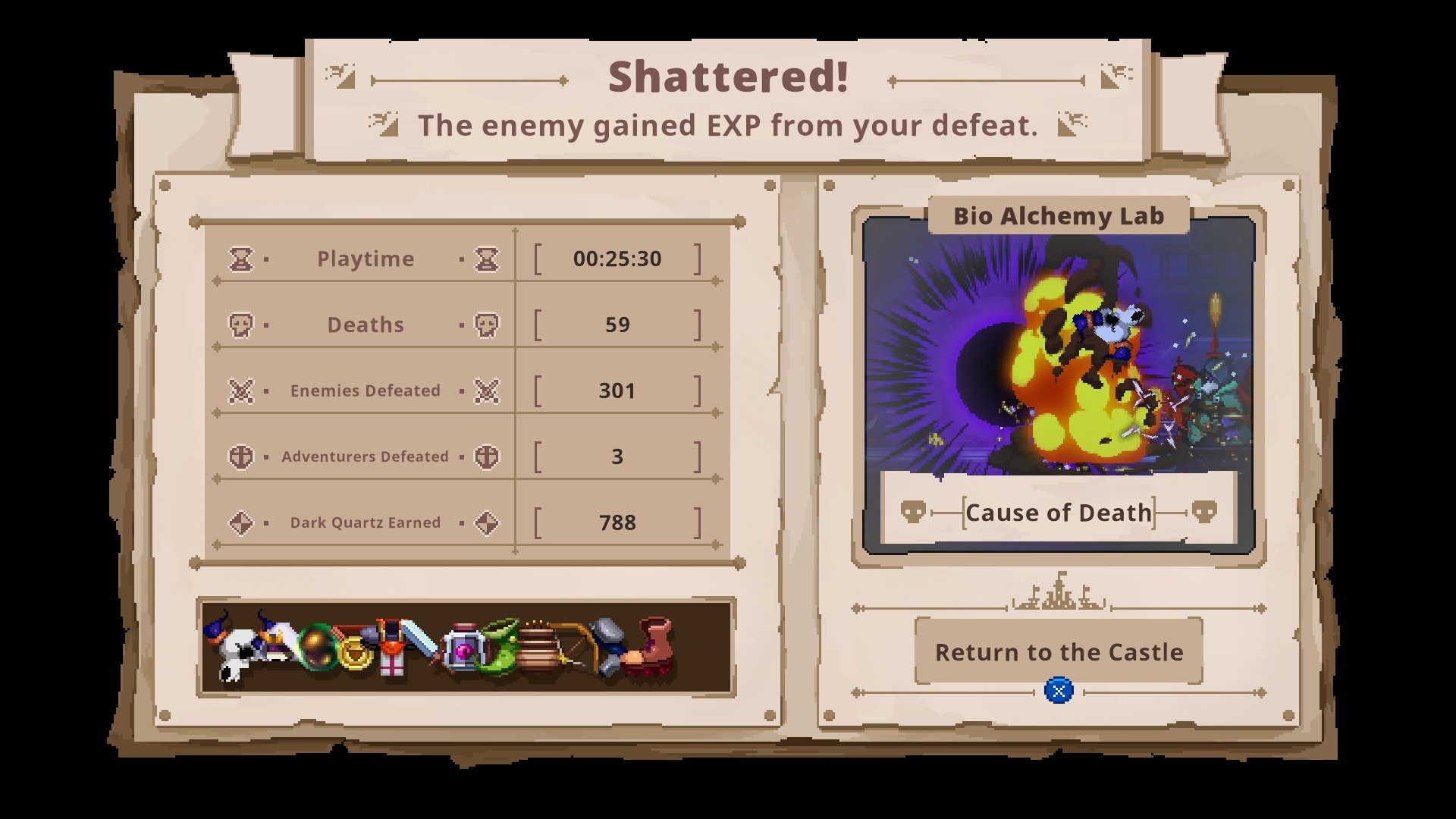 Skul complicates that last one even more when you consider that the items you drop can be sold for currency to purchase things at the in game shop, but only if you’ve spent your experience points (dark quartz) on the proper upgrade. This upgrade is among the most expensive in the game, making investing in it incredibly prohibitive without EXTENSIVE grinding. Otherwise, items you pick up are largely worthless when you no longer need them, making investing an inventory slot on them in the short term feel extra bad when you let them go.