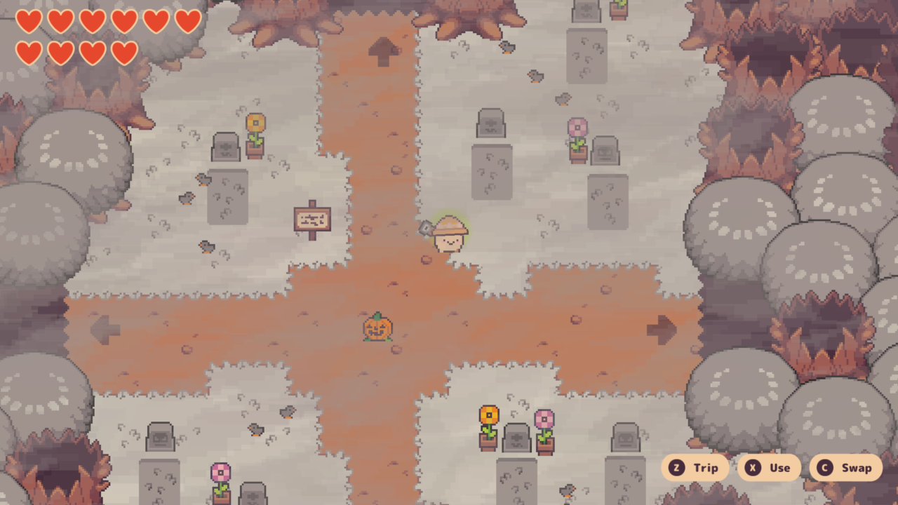 Snoozy Kazoo’s love letter to everything Zelda is a pretty painless time right up until you get to its version of the lost woods, The Grim Graveyard. Up to that point, Turnip Boy is a brisk action adventure with extremely little challenge but an impressive amount of interesting environmental puzzles and fun tools to spice traversal and combat up with. Watering certain plants with your watering can item will cause them to sprout things like bombs that you can kick across rooms or watermelons shaped like giant blocks that can be moved to open pathways or block attackers. My favorite – the pocket petalportal – allows you to plant one end of a portal, which can connect to either another of your portal plants or ones that occur naturally in the stage. Most rooms really lean on your ability to actively use what’s at your disposal to dispatch enemies or solve problems.